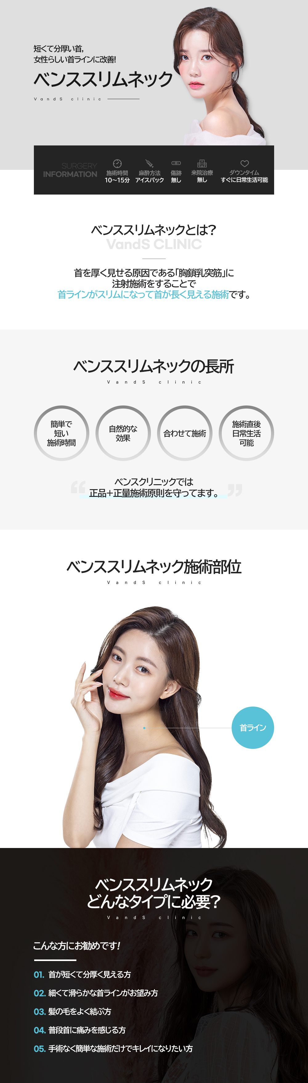 -首を厚く見せる原因である首斜筋(胸鎖乳突筋)に注射施術を行い、首のラインが薄くなり、首が長く見える施術です。